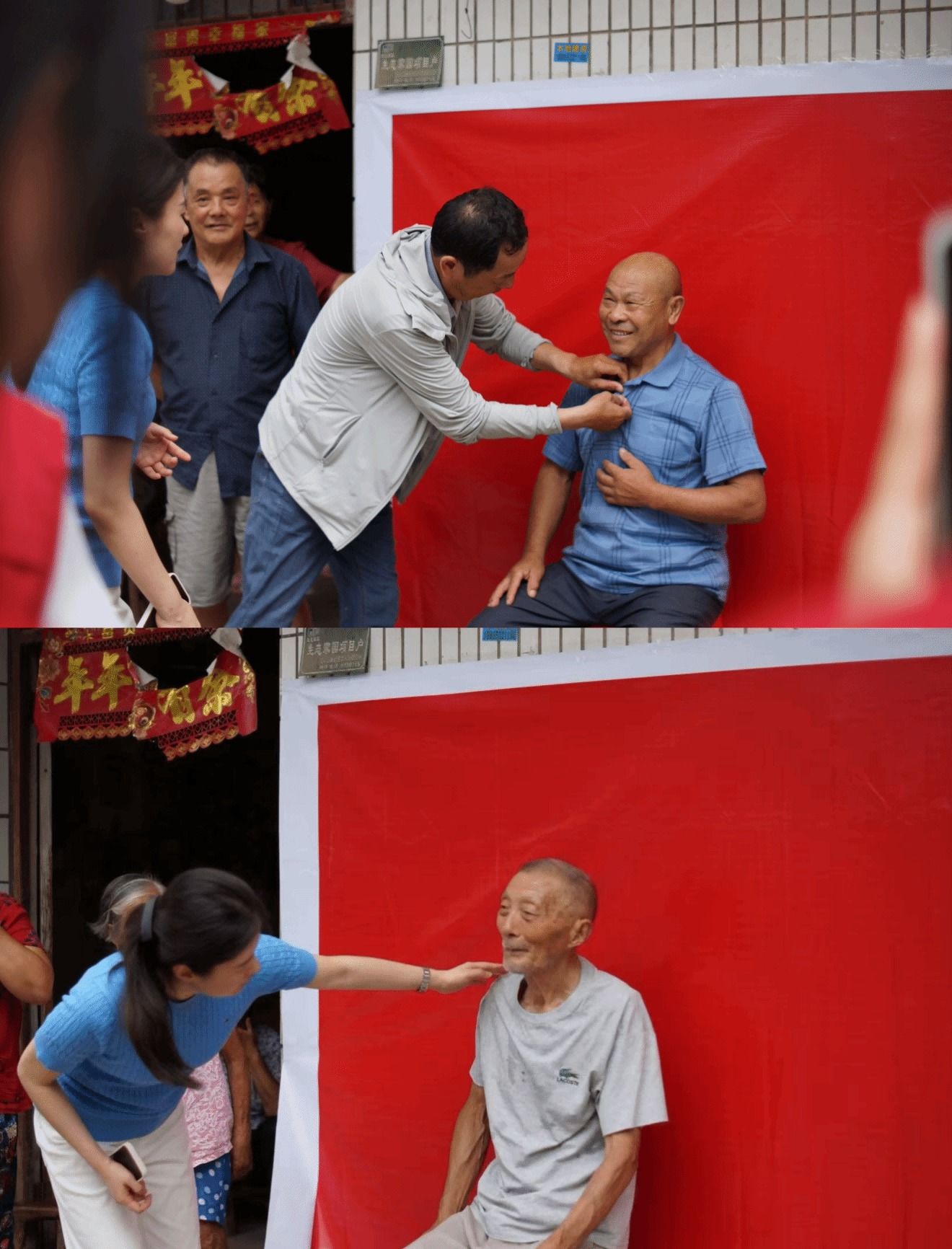 当团队刚架起相机时,78岁的王爷爷说:“给我拍帅一点!”在拍摄了3次后,王爷爷终于满意地看着相机显示屏的照片。现场界首村村支书和李雯雯也当起了造型师,一个帮老人整理衣服,一个负责发型的设计,让每位老人都能以最精神的面貌留下珍贵影像。