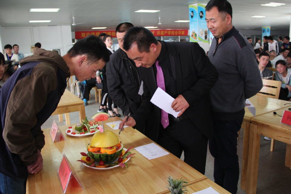 412中午12:30 ,第四届大学生美食节系列活动之“倾国倾城”水果拼盘大赛在新食堂三楼成功开展,团委书记王蓓蓓、院团委老师何文婧、后勤服务公司副总经理王立新经理熊宝武、后勤老师永光 、王书籍担任此次比赛评委。