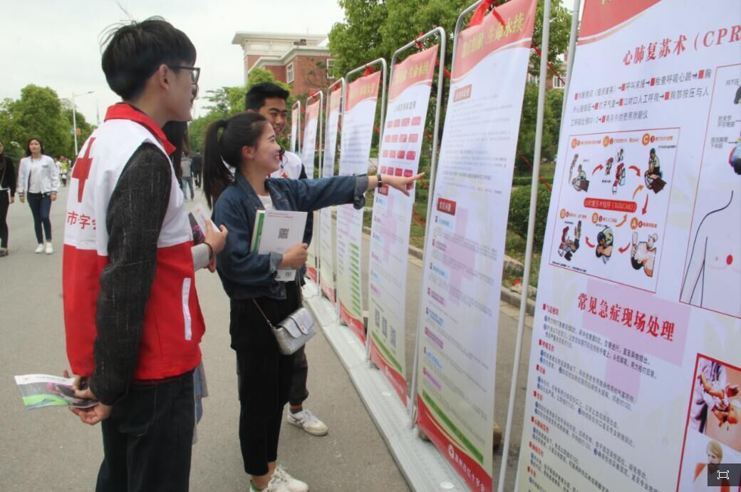 活动现场用展牌展示的内容有中国红十字会的起源、红十字会的主要工作、广大青年捐献造血干细胞的意义、应急救护知识、心肺复苏技术演示过程等。此外院学生会成员向广大同学发放了有关应急救护知识方面的宣传资料,普及防灾救灾知识以及日常急救的方法。