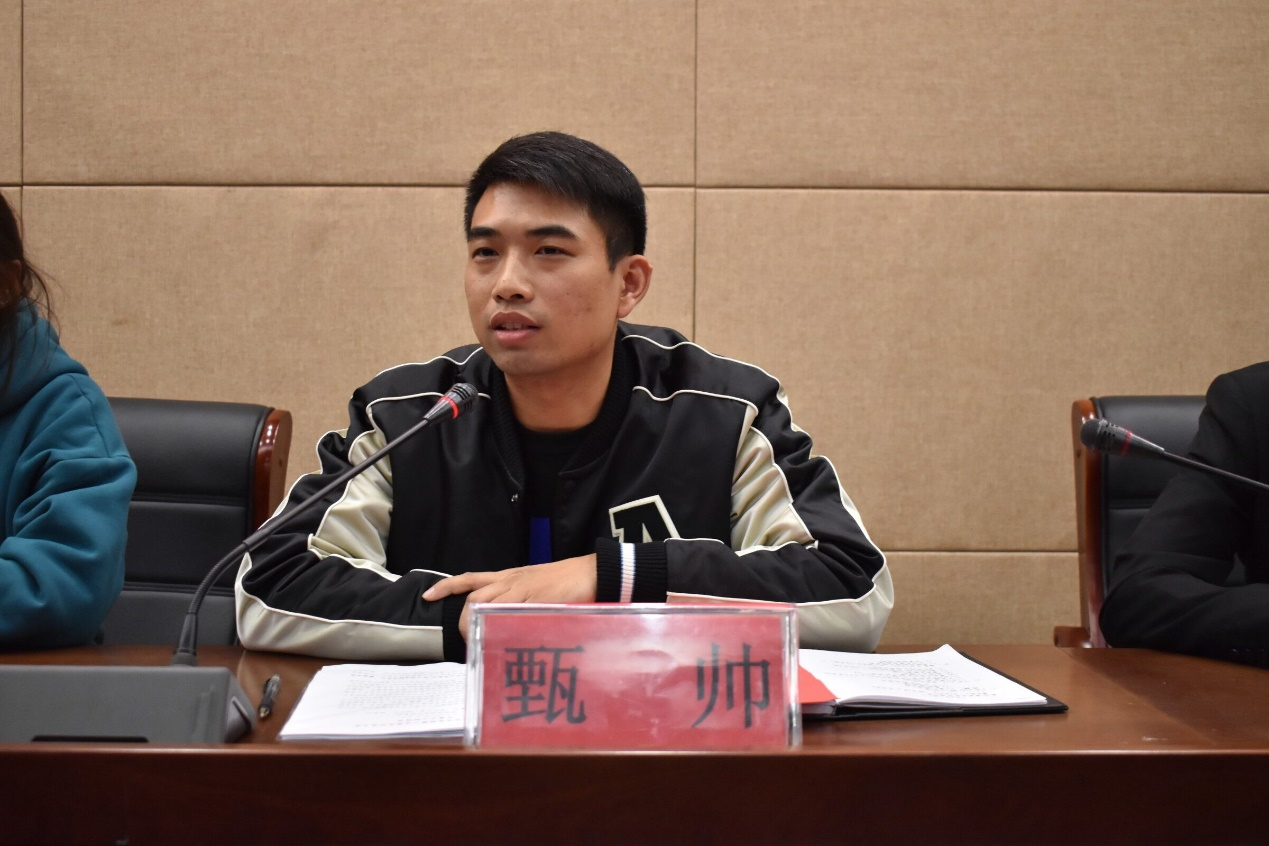 大会第三项,由校团委副书记甄帅书记讲话。他肯定了在这次学代会的工作中同学们付出的努力,对当选的主席、部长表示祝贺,之后他对同学们提出了三点要求,一是希望同学们志存高远,增加自己的经验积累;二是学习专业知识,既要学习专业技能,又要学习组织能力;三是要开拓进取,勇于创新,在制度和管理上进行创新。