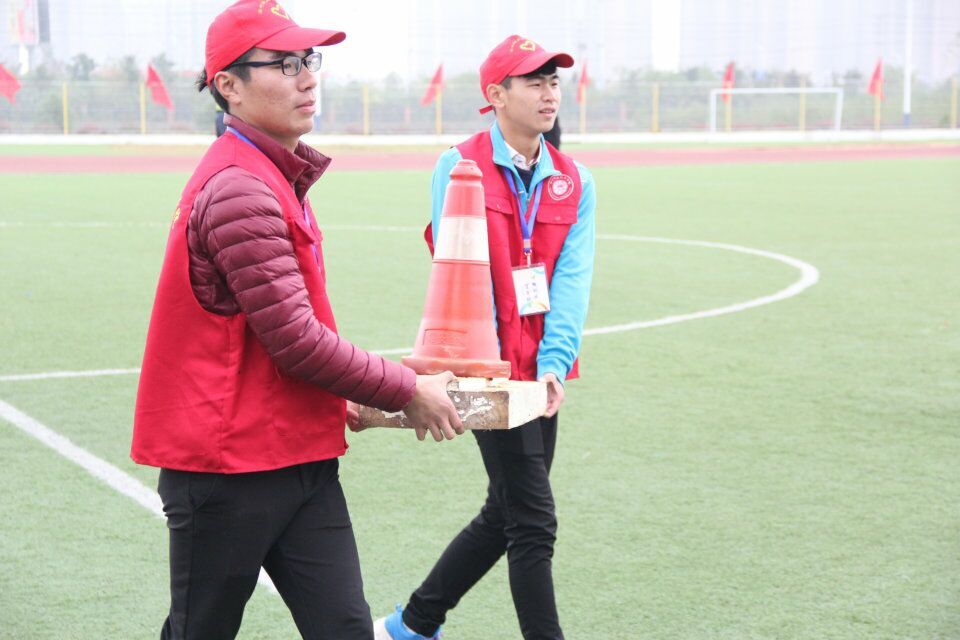 比赛前,他们穿着红马甲,戴着红帽子站在操场跑道的两旁,维持着赛场秩序。比赛时,他们要时刻提醒人们不要离赛场太近,以避免不必要的受伤。运动员比赛完,他们会及时上前搀扶,防止运动员因身体透支而倒下。比赛后,他们还要保证运动场的清洁等等。虽然温度较低,但却因为他们的无私奉献而变得不再寒冷。