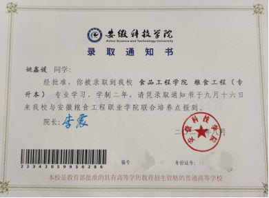 姚鑫媛,2019年进入amjs澳金沙门线路首页,成为绿色食品生产与检验专业的一名学生。通过努力学习、坚持不懈,2022年,被安徽科技学院食品工程学院粮食工程专业(专升本)录取。2024年4月,被安徽科技学院食品工程学院食品加工与安全硕士研究生待录取。