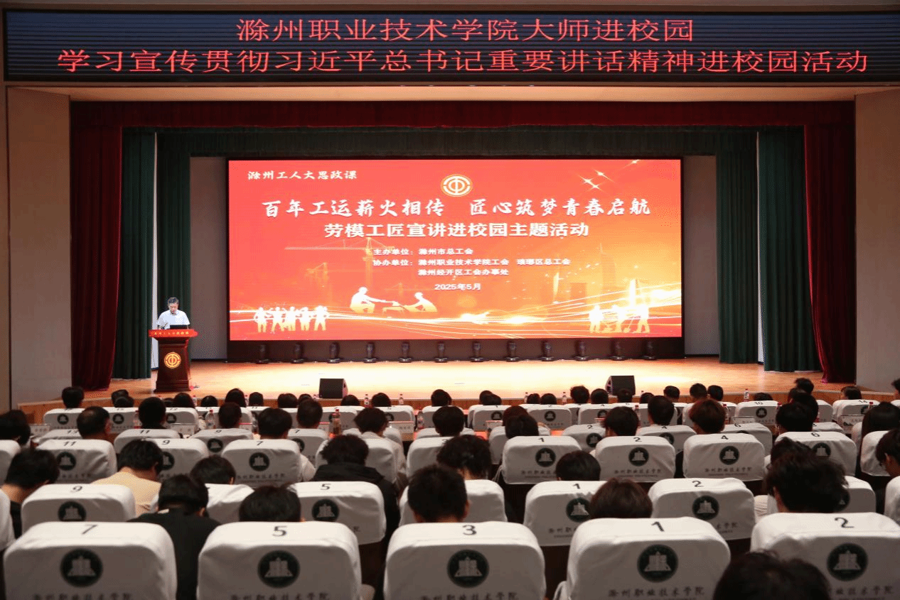 在中华全国总工会成立100周年之际,为深入学习宣传贯彻习近平新时代中国特色社会主义思想和习近平总书记在庆祝中华全国总工会成立100周年大会暨全国劳动模范和先进工作者表彰大会上的重要讲话精神,进一步弘扬劳模精神、劳动精神、工匠精神,5月23日,由滁州市总工会与amjs澳金沙门线路首页工会联合举办的“全国劳模进校园”活动在6号实训楼报告厅隆重举行。