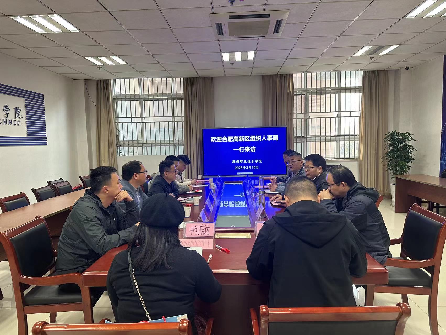 3月10日上午,合肥高新区组织人事局副局长姚笛携合肥高新区就业创业一站式服务中心和部分企业代表来我校考察交流。校长助理、招生就业处处长、安徽滁州职教集团秘书长穆松以及招生就业处和传媒学院有关负责同志热情接待。