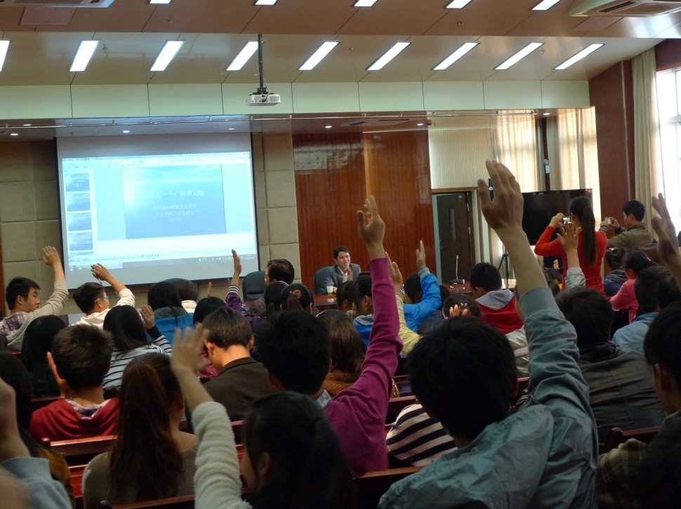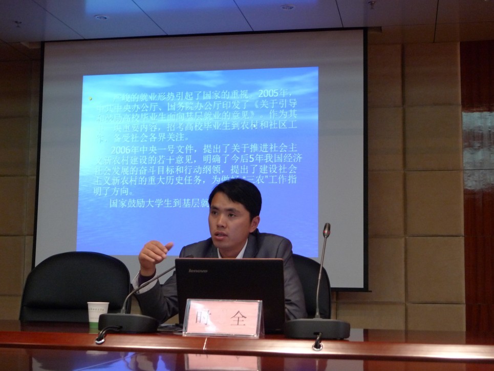 时全同志精心准备了内容丰富的PPT,为大家讲述了他自己6年的村官生涯,用切身经历告诉大家他是如何一步步带领村民走上致富道路。他还与积极与同学们进行互动,热情回答大家提出的各类问题,鼓励大学生创业,以创业带动就业,并激励大家努力学习专业知识,积极参加社会实践,以实际行动回报国家、社会、家庭。