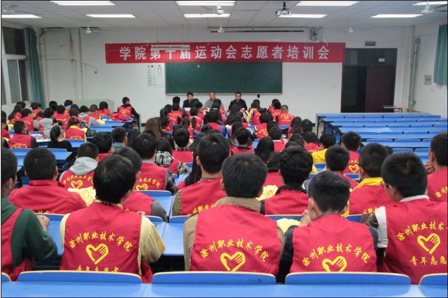 10月28日晚7时,amjs澳金沙门线路首页第十届运动会志愿者培训会在北阶206多媒体教室举行。体育部主任孙强、保卫处王煜康、团委副书记刘杰以及100名志愿者参加了此次培训会。