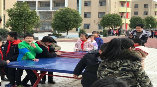 随着上课铃声的响起,在老师的带领下,社联的工作人员和乒协的伙伴们组织三年级、四年级、五年级的小学生们有组织的拉火车到操场集合,自觉的站好队。