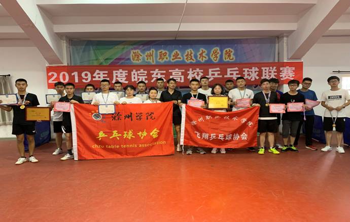 为进一步加强皖东各高校乒协、俱乐部之间的联系,丰富大学生校园体育文化,提高大学生乒乓球运动水平。由我校大学生体育协会主办、校飞翔乒乓球协会承办的“2019年度皖东高校乒乓球联赛”6月16日在我校体育场乒乓球室成功举办。来自滁州四所高校参赛代表队60余人参加比赛。