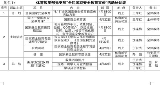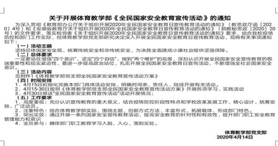 为深入贯彻《教育部办公厅关于组织开展2020年全民国家安全教育日宣传教育活动的通知》(教思政厅函〔2020〕4号)和《安徽省教育厅关于组织开展2020年全民国家安全教育日宣传教育活动的通知》(皖教秘思政〔2020〕20号)的文件要求,落实校党委《关于组织开展2020年全民国家安全教育日宣传教育活动的通知》统一部署,结合我校疫情防控和部门工作实际,在全民国家安全教育日即将到来之际,体育教学部直属党支部积极响应,制定体育部《全民国家安全教育宣传活动方案》和部门《全民国家安全教育宣传活动计划表》,细化各项主题学习时间节点、明确不同教育环节责任分工,活动将于4月15日至30日按计划进行。