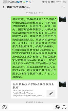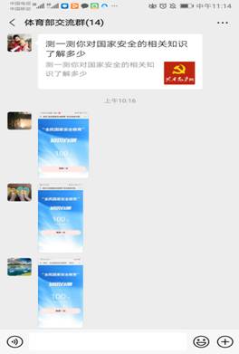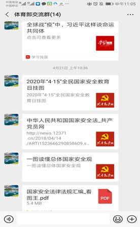 为深入贯彻《教育部办公厅关于组织开展2020年全民国家安全教育日宣传教育活动的通知》(教思政厅函〔2020〕4号)和《安徽省教育厅关于组织开展2020年全民国家安全教育日宣传教育活动的通知》(皖教秘思政〔2020〕20号)的文件要求,落实校党委《关于组织开展2020年全民国家安全教育日宣传教育活动的通知》统一部署,结合我校疫情防控和部门工作实际,4月15-30日,体育教学部由党支部牵头组织部门全体教职工采用“线上线下相结合”的方式,灵活运用部门网站、微信群、QQ群、学习强国等媒介,广泛宣传《中华人民共和国国家安全法》、《全国全民安全教育》等国家安全法律法规,营造“国家安全、人人有责”的浓厚氛围,力戒形式主义,坚决防止走形式、走过场,严格保密纪律,严防失密事件发生,切实将校党委通知精神落实到实处。