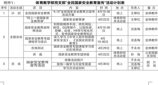 深入推进国家安全教育学习走向深入,入脑入心。体育教学部党支部充分发挥基层党组织战斗堡垒作用,4月14日,在国家安全教育日来临之际,及时召开支委会,研究部署体育教学部《全民国家安全教育宣传活动实施方案》,细化各项主题学习时间节点、明确不同教育环节责任分工,在此基础上,制定部门《全民国家安全教育宣传活动计划表》。