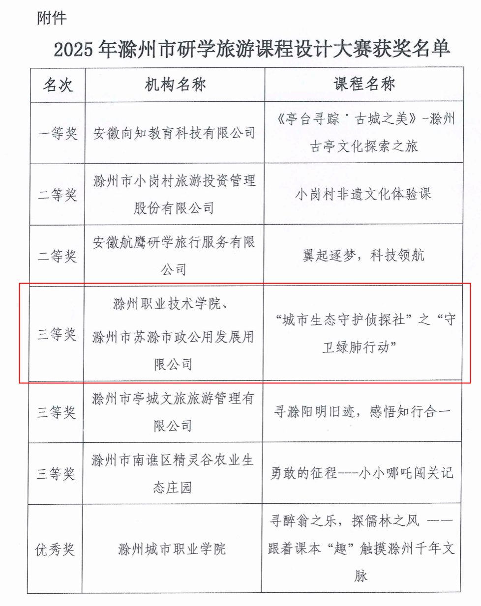 此次获奖是我院旅游管理专业服务地方文旅产业发展、提升社会服务能力的重要体现。未来,旅游管理专业将持续发挥专业与人才优势,深化产教融合、校企合作,不断推出更多兼具教育价值与地域特色的优质研学课程,为滁州打造区域性研学旅行目的地贡献"滁职智慧"与创新方案。