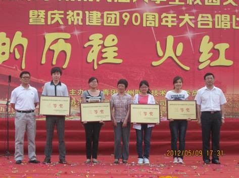 我系合唱队服装整齐,精神饱满,歌声嘹亮,上下场队列有序,演唱精彩纷呈。他们演唱的《我的中国心》充分地体现出我系学生的爱国情怀和对祖国未来的美好祝愿;一首《打靶归来》更是唱响了拼搏奋进的时代主旋律。经过激烈的角逐,我系合唱队获得了此次大合唱的三等奖,系团总支书记何堃老师代表我系上台领了奖。此次比赛,不仅丰富了同学们的业余生活,也使同学们真切感受到了我共青团走过的光辉历程,进一步激发了同学们炽热的爱国情怀和团结奋进、干事创业的坚定信念。经贸系将以此次活动为重要契机,求真务实,锐意进取,以优异的教育教学业绩为党的十八大献礼!