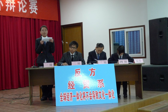 amjs澳金沙门线路首页第十届“智慧杯”大专辩论赛决赛于2010年11月24日下午5时许在老校区行政楼六楼报告厅隆重举行。本次决赛由经贸系和机电系两支队伍同台,围绕辩题“全球经济一体化将会不会导致文化一体化”展开辩论。作为反方的我系由韩波带队、刘蓓蕾指导、宋春萍场下发言、一辩冯忠倩、二辩夏京、三辩高原、四辩张默,力证观点:“经济一体化讲不会导致文化一体化”。本次比赛吸引了众多学生观看,场下座无虚席。最终在激烈的辩论后,经评委老师们客观公正的评分,我系因表现突出,以绝对优势再次卫冕冠军。充分反映了我系学生良好的思辨素质和精神风貌。