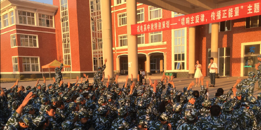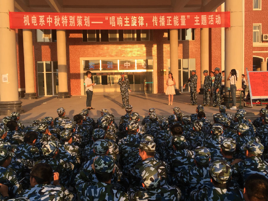 九月是充满喜悦和希望的季节,我们在九月迎来了抗战胜利70周年的盛大庆典,迎来了2015届可爱的大一新生们,也迎来了一年一度的中秋佳节。值此中秋佳节之际,为了给大学新生上好“开学第一课”,让新同学们牢记历史,抒发思念家乡、努力学习、爱家爱校爱国的家国情怀,树立为中华民族伟大复兴的梦想贡献力量的理想信念,9月27日下午机电系团总支在新生军训营地,精心设计了一场别开生面的“唱响主旋律,传播正能量”主题活动,机电系党总支书记晋太洋、机电系辅导员高阶老师、机电系团总支负责人谢丽丽老师参加了此次活动!