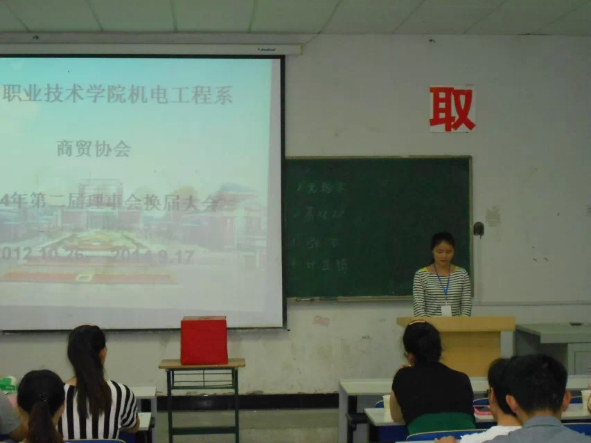 最后,机电系团总支负责人谢丽丽老师为此次换届大会做了总结,她指出,社团是学生自我管理、自我服务、自我成长的一个有效载体,希望全体会员在新一届理事会的带领下,齐心协力,努力把商贸协会发展成一个让每位会员都能展现自己、锻炼自己、发展自己的舞台。