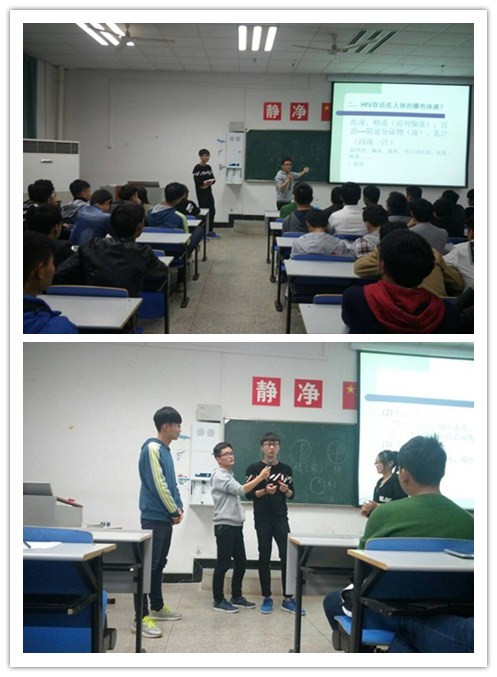 为了加强大学生对艾滋病的防控意识和防护的技能。机电系学生会2016年11月14日晚在北阶104、204教室同时进行了两场预防艾滋病同伴教育讲座,本次讲座获益人群覆盖全体大一新生,讲座分别由我系学生赵钧泽、詹啸、郭程晨、吕云凤主讲。