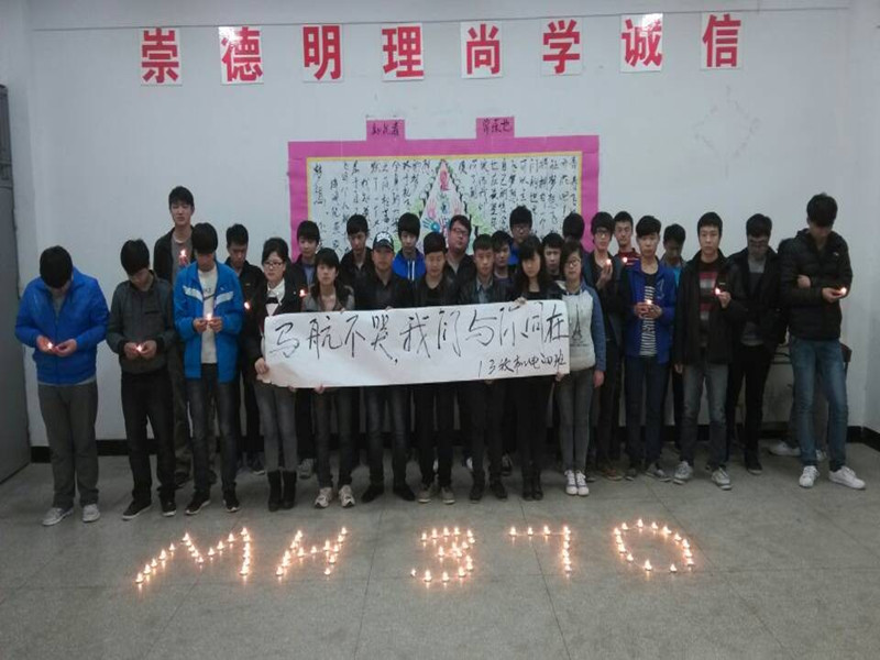 我班同学听此消息后深感悲恸,自发组织为马航祈福。大家用整齐,洪亮而悲痛的声音喊出:“马航不哭,我们与你同在!”。