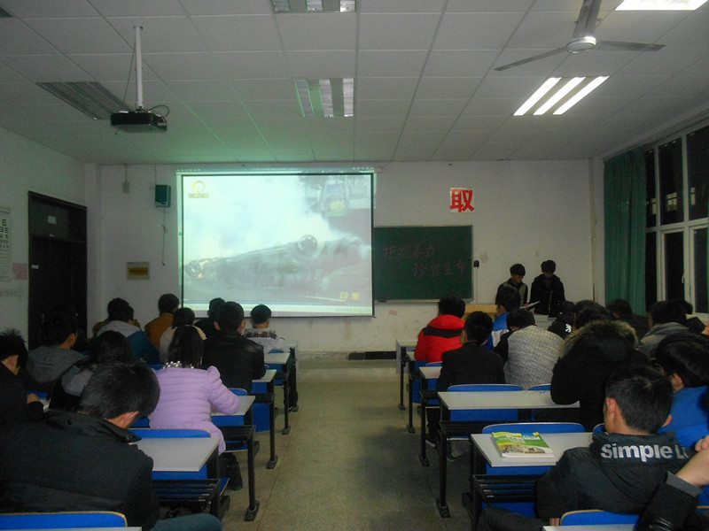活动首先通过一些关于昆明事件的短片简单的描述了一下昆明事件爆发时的惨烈场景,民众自发的援救措施以及相关部门的迅速反应,及时的停止了这场暴力活动。在场的每位同学都能体会到当时的混乱局面。在短片结束之后,在场的所有人都起立为在昆明事件中受伤遇难的同胞哀悼一分钟,场面庄严肃穆。哀悼之后,主持人给在场的同学介绍大学生如何抵抗暴力保护自己的生命安全。整场活动就此顺利结束。