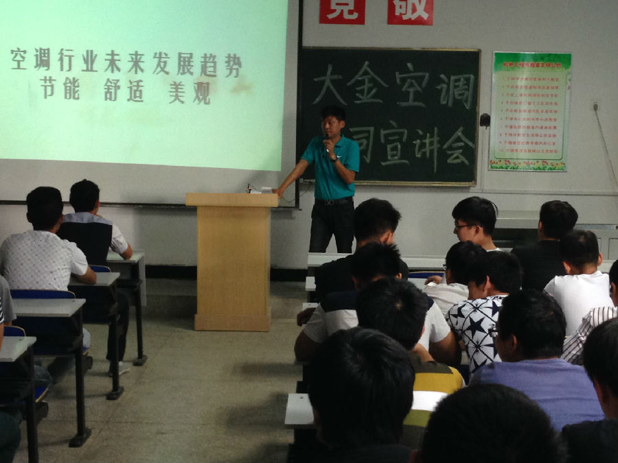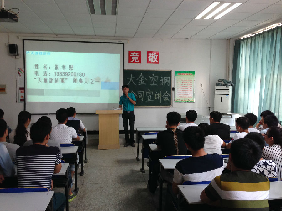 为了使机电工程系13与14级制冷班学生有一个更好的就业机会,也为他们能够对毕业后就业有一个深度的了解,机电工程系于2015年9月16日下午3点在5103教室联合大金空调公司举办一场以制冷专业实习就业的宣讲会,并特邀天诚舒适家的创办人张孝慰为大家演讲。机电工程系13、14制冷班全体同学参加了本次宣讲会。
