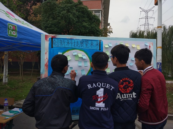 本次活动由机电系团总支筹划并举办,团干早早的在楼下布置活动场地,做好了准备工作。以饱满的热情迎接同学们的参与。活动刚开始便吸引了众多同学,大家反响热烈、积极参与,纷纷在便利贴上写下对于“创新科技,成就未来”的想法和对未来的祝福并贴在展示栏上。不一会展示栏里便密密麻麻的贴满了同学们对于未来的期望和祝福。越来越多的同学参与进活动中,一时间热闹非凡