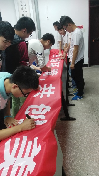 活动于512日顺利开展,活动中同学热情高涨,放下矜持,活动成员请来往的同学关注文明公约和校园文明倡议书,同学问看了我们的倡议书,都主动的来到印有“爱护校园环境,共创美好滁职”的横幅前写下自己的誓言和名字。