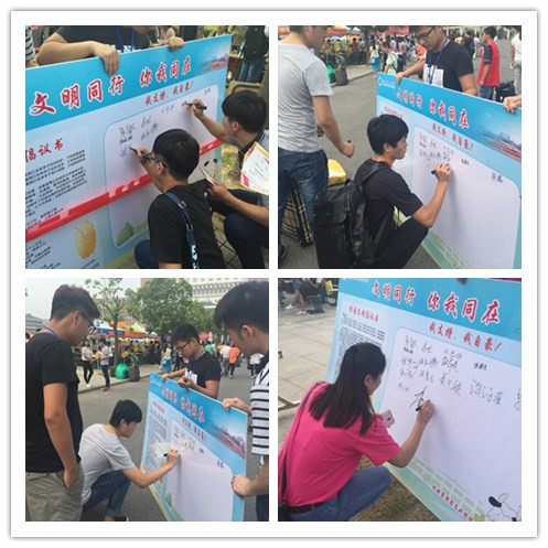 热情的不仅是天,还有我们的心,在接待新生的同时,我系团总支学干们让新生阅读了我系提出的校园文明倡议书,来往报道的新生都进行了仔细阅读,表示自己一定可以做到倡议书上的内容,为了表示自己的支持,新生们纷纷在右侧的签名板上留下了自己的姓名。