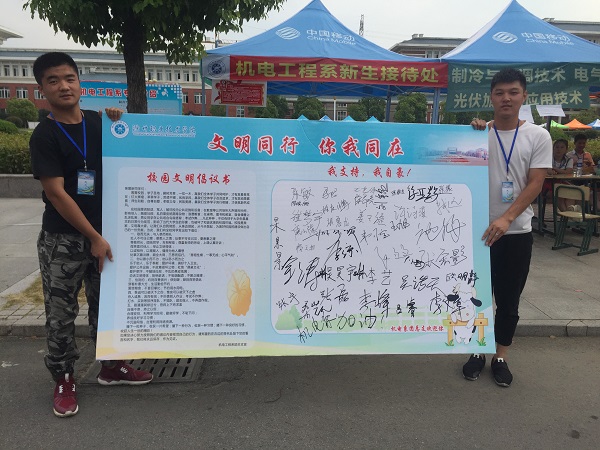 910号是个非常特殊的日子,这一天是我院新生报道的第一天,为了让新生了解大学对文明校园的重视,机电系开展了校园文明倡议签字活动,来我系报名的新生都积极的参加了此次活动。