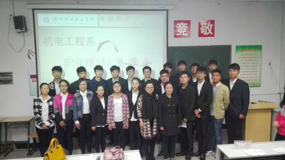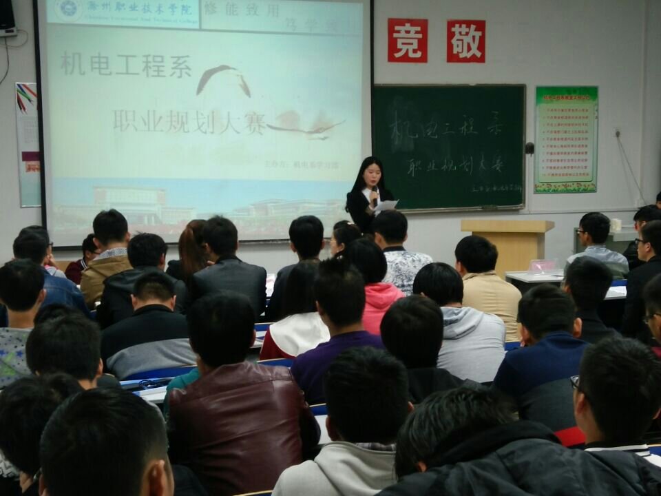 为传播和普及职业规划理念,帮助同学们学习、掌握职业规划的基本方法,树立正确的成长关和就业观,机电系学生会学习部于2015年11月4日在5103教室成功开展大学生职业生涯规划大赛活动。机电系团总支指导老师谢丽丽老师、学生辅导员冯早红老师、团总支副书记张宏影、学生会主席岳德辉、王梦瑶担任本次比赛评委,学生会各部长以及各班级代表成员出席了本次大赛。