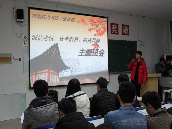 为了提高同学们的思想觉悟,增强同学们的安全防范意识,2017年1月5日下午四点,机电系于5103教室开展了“诚信考试、安全教育、网贷风险”期末主题班会。班会由我系辅导员冯早红老师主讲,15级机电五班、制冷班、光伏班、电气一班同学认真听取学习会议内容。