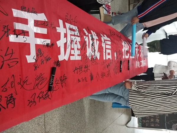 活动开始,在我系学生会干事的宣传下,同学们纷纷有秩序地来到横幅前,并郑重的签下自己的名字,每个名字都深深地印在有“手握诚信,把握未来”的红色横幅上,也深深地印在了心里。活动的最后,学生会的各部门学干也同样在横幅上留下了自己的名字,作为学干更应自觉加强诚信建设,做好领头羊的作用,用实际行动践行社会主义核心价值观。