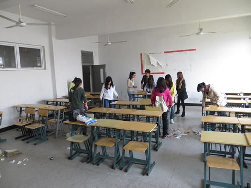 (经贸系同学正在清扫教学楼部分教室)