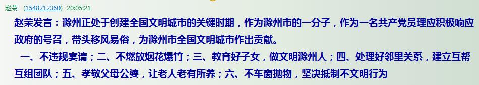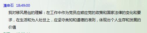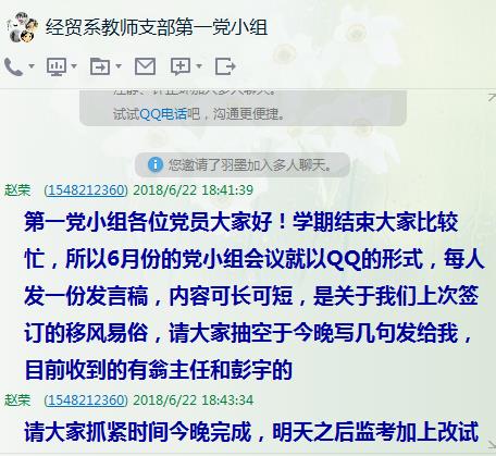 2018年5月底,滁州市法制办组织全体党员干部开展“移风易俗”承诺书集中签订活动,经贸系全体党员教师参加了此次活动。围绕此次“移风易俗”倡新风活动,6月15-22日经贸系教师党支部第一党小组利用QQ讨论组就“移风易俗”展开了大讨论,目的在于,要求广大党员同志要进一步提高认识,加强落实,要做好表率,坚持喜事新办、丧事简办、祭祀雅办、小事不办,管好自己、带好亲属、影响他人,自觉抵制陈规陋习和封建迷信活动,做移风易俗的示范者;要反对攀比浪费,积极倡导节约文化;要树立文明新风,注重家庭、家教、家风传承培育,遵守社会公德,争当文明滁州人。