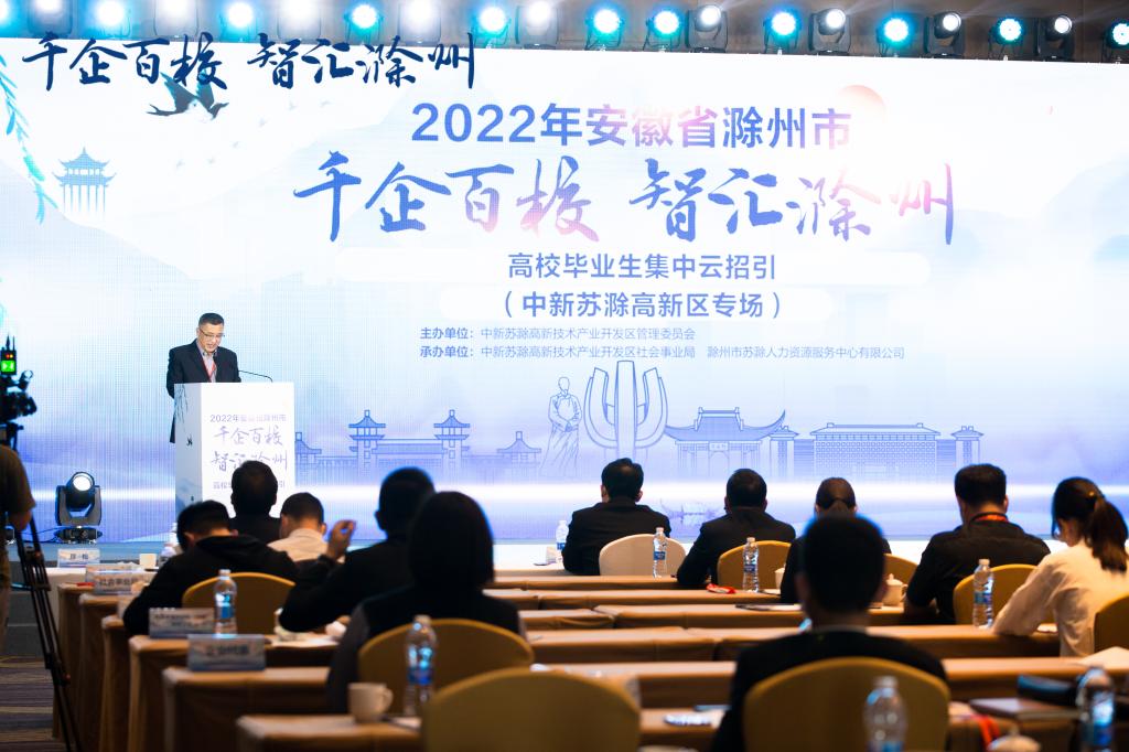 4月26日上午,由中新苏滁高新技术产业开发区管理委员会主办,中新苏滁高新技术产业开发区社会事业局、滁州市苏滁人力资源服务中心有限公司承办的“千企百校•智汇滁州”高校毕业生集中云招引(中新苏滁高新区专场)启动仪式在港汇喜来登二楼宴会厅举行,本次活动面向中新苏滁高新区所有企业及安徽理工大学、淮南联合大学、安徽工贸职业技术学院等高校毕业生。我校校长助理、招生就业处处长穆松,招生就业处副处长王义利受邀出席。穆松作为高校代表应邀发言。