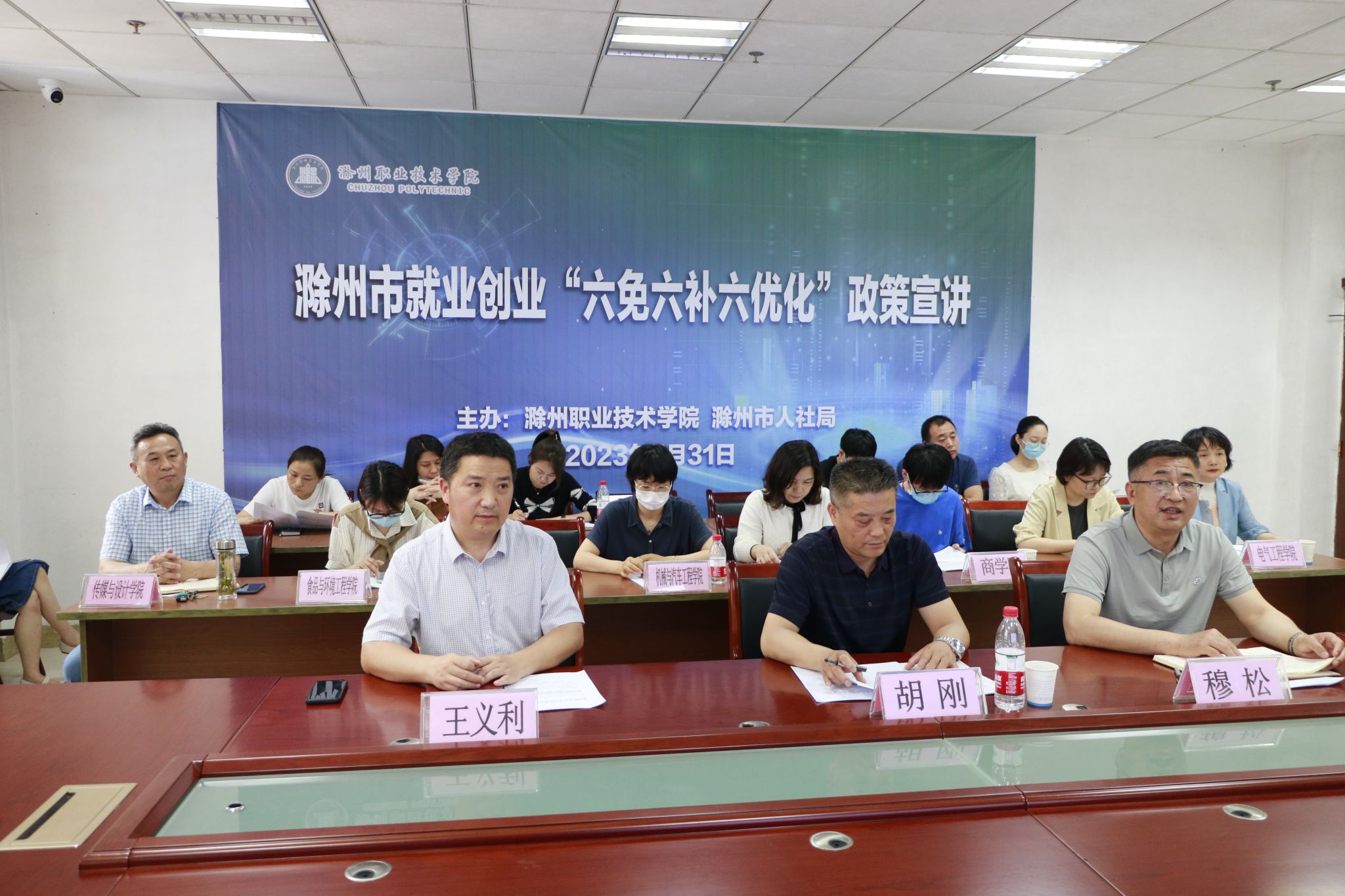 5月31日下午,我校在118会议室举办滁州市就业创业“六免六补六优化”政策宣讲会,邀请滁州市人力资源和社会保障局就业科科长胡刚到校宣讲。校长助理、安徽滁州职业教育集团秘书长、招生就业处处长穆松,招生就业处副处长王义利,各二级学院副书记及辅导员代表参加会议。另有2023届毕业生通过腾讯会议线上观看,会议由王义利主持。