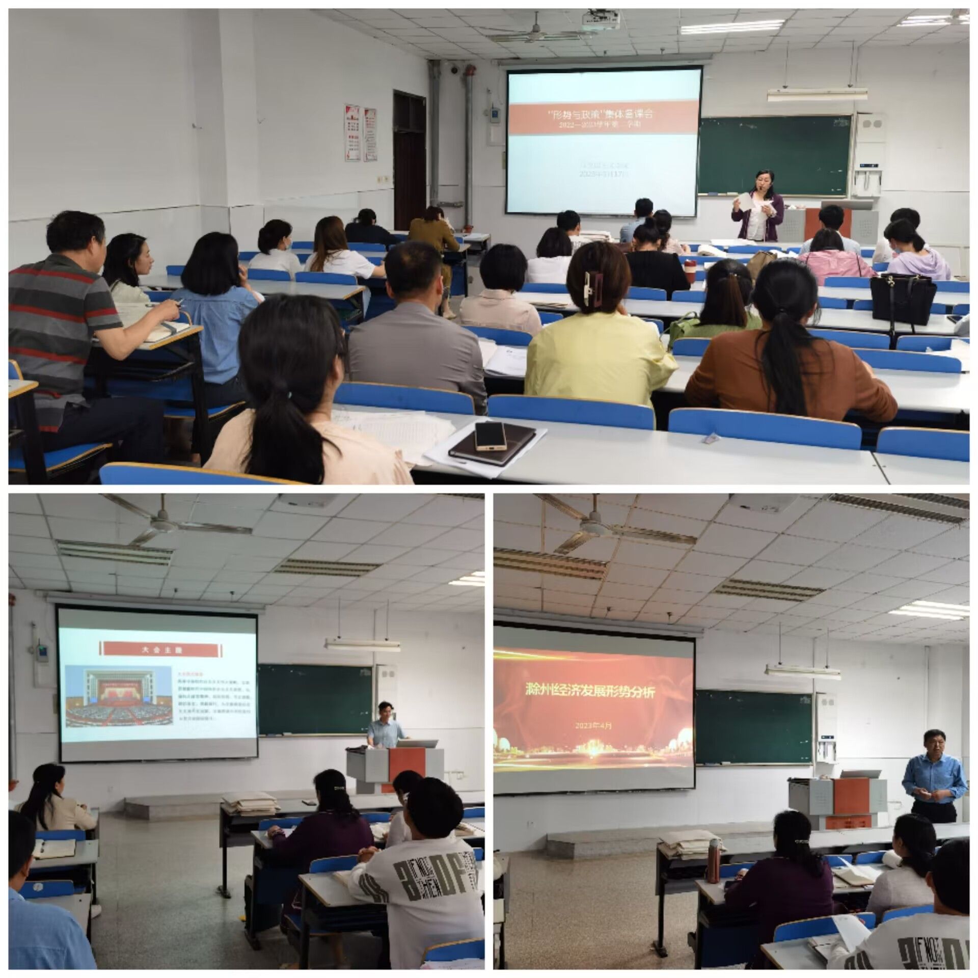 会上,张家莉介绍本学期“形势与政策”课将由马院负责统筹、各个教学院部负责组织实施,教学安排依然采取的是“校领导+总支书记+辅导员+思政课教师”模式组织“形策”课,对课程开设做了相关工作要求,提出二级学院在课程开设中如遇到问题或者困难都可以找马院协调解决。随后,马院在1101教室召开“形势与政策”课集体备课会,本次课程教学的相关开课教师参加,孔金、张家莉和汪立超三位老师先后就《深入学习贯彻党的二十大精神》、学习贯彻《习近平总书记教育重要论述讲义》、《滁州经济社会发展形势》三个专题进行了备课内容汇报。