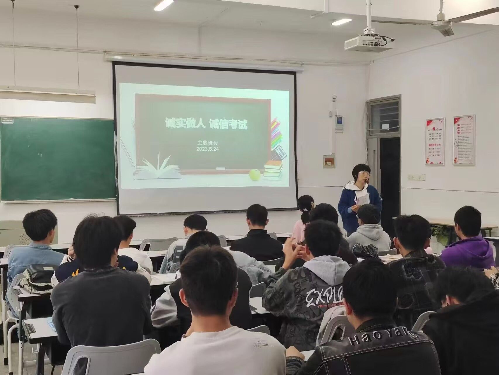辅导员吴佳佳首先传达诚信考试教育内容,并带领同学们学习《国家教育考试违规处理办法》及《学生手册》中违规考试的处理办法,强调诚信考试教育严重性;接着,传达学校《2023年学生读书行动实施方案》,提醒学生养成读书习惯;最后,围绕日常安全教育再次提醒,内容包括防溺水、宿舍严禁使用大功率电器、钓鱼、防电诈(AI诈骗)、电动车骑行安全等方面。