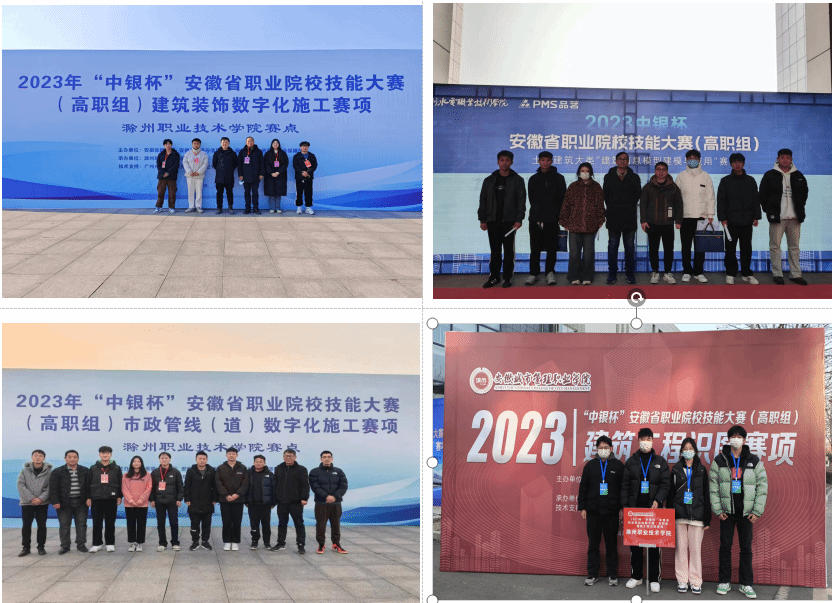 2023年安徽省职业院校技能大赛高职组共设土木建筑大类8个赛项,我院根据自身设备等情况遴选建筑装饰数字化施工、建设工程数字化计量与计价、建筑工程识图、建筑信息模型建模与应用、市政管线(道)数字化施工等5项,参赛项目全部获奖。另参加资源环境与安全大类地理空间信息采集与处理赛项获二等奖2项。