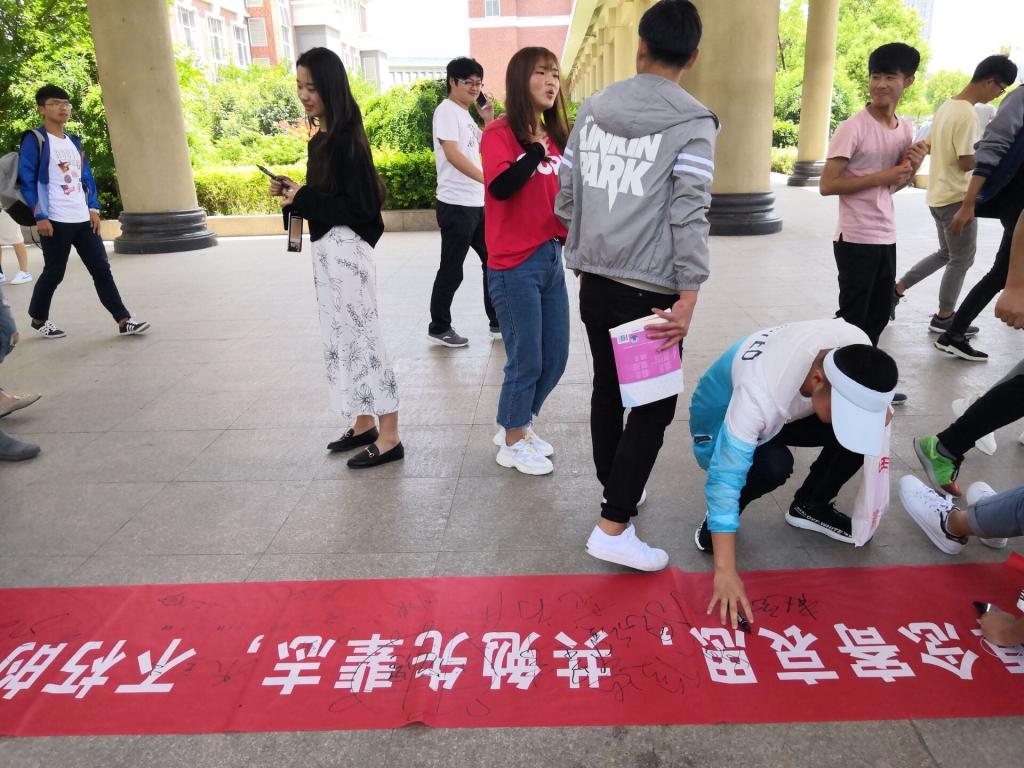 活动现场,工作人员向过往的同学们介绍五四青年节的来源,宣传五四精神“爱国、进步、民主、科学”的具体内涵,同学们也纷纷在横幅上签下自己的名字,以表达对五四运动中革命先烈的敬仰之情。