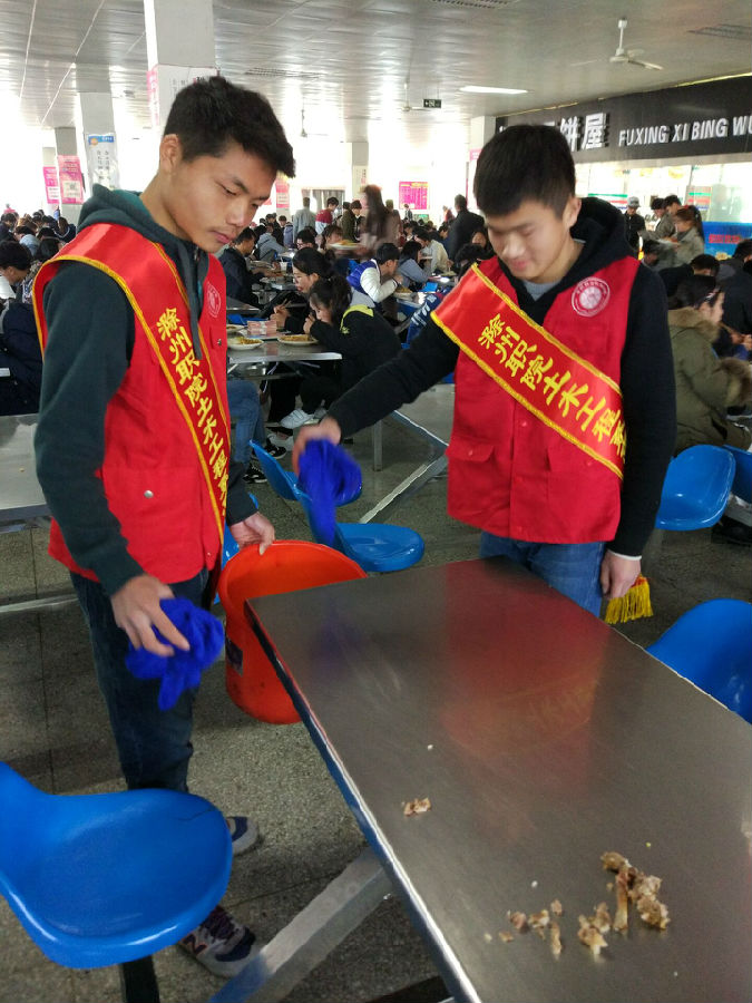在本次活动中,学生会秘书处成员一起帮助阿姨擦桌子、收盘子、后厨打汤、拖地、倒垃圾、打扫食堂卫生、保持食堂整洁等;组织安排学生会成员在食堂内进行“文明就餐”的督导,发现浪费粮食、不放回餐盘、打饭插队等不文明行为立即进行劝解和制止。