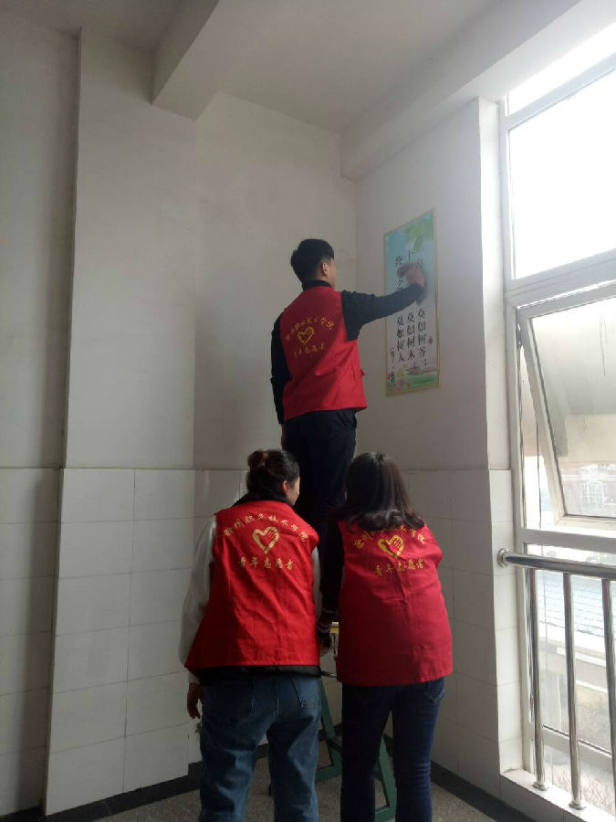 活动当日,青年志愿者们自带扫把、抹布及垃圾袋,不畏脏、不怕累,积极的参与到活动当中。大家分工明确。打扫过道走廊,先试用扫帚扫除尘土,再用拖把拖一遍,用抹布擦拭楼梯扶手、栏杆、挡板、墙壁饰物、窗台、门窗玻璃以及名人名言牌等。打扫教室,把没有摆放整齐的课桌课椅,按照地板线摆放整齐,横竖对齐,清理讲桌内外地灰尘、教室的死角、墙上的笔迹脚印等,且将破损的桌子椅子用本子记下来,方便及时的上报维修。整理自行车,既保持自行车的整齐排列,又没将自行车距离移动过大,以避免车主找不到自行车的情况出现。 最后顺利切圆满的完成了这次“洁净教室,美化校园”活动。
