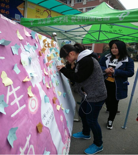 活动一开始在女生宿舍楼举办,凡是经过的女生,都会收到各种各样的糖果。拿到糖果的女生,都有机会在心愿板上留下自己的心愿与祝福。在口中的糖果带着丝丝甜意划入口腔间的同时,手上的纸张带着文字,在心愿板上缓缓流淌着真心的祝福。在学生会女生部成员的协助下,将满满的祝福传递。