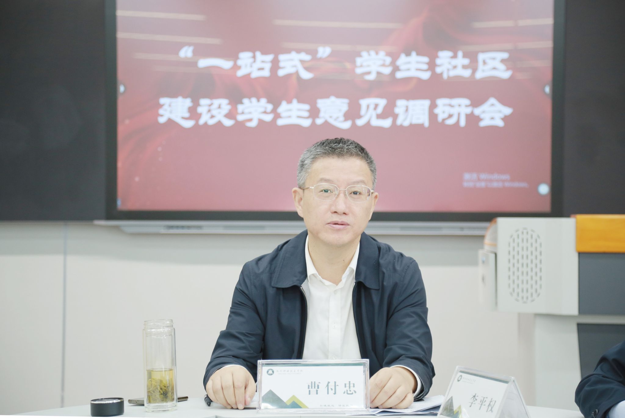 曹付忠在认真听取师生代表和有关部门座谈交流发言之际,指出,广大同学积极参与学校“一站式”学生社区建设,并积极建言献策,发表了很多中肯的意见和好的建议,充分体现了我校学子关心学校育人工作和高质量发展的初衷与积极进取的良好精神风貌。就学校“一站式”学生社区建设工作,曹付忠指出,要坚持以生为本、以学生为中心的育人理念,着力解决好广大学生的“急难愁忧盼”;要加强学习,吃透文件精神,学中做、干中学,结合过往的经验做法,创新工作方式,着力加快推进“一站式”学生社区建设;要部门联动,强化宣贯,引导广大学生积极共建共治共享,形成合力,高质量建设好“一站式”学生社区。