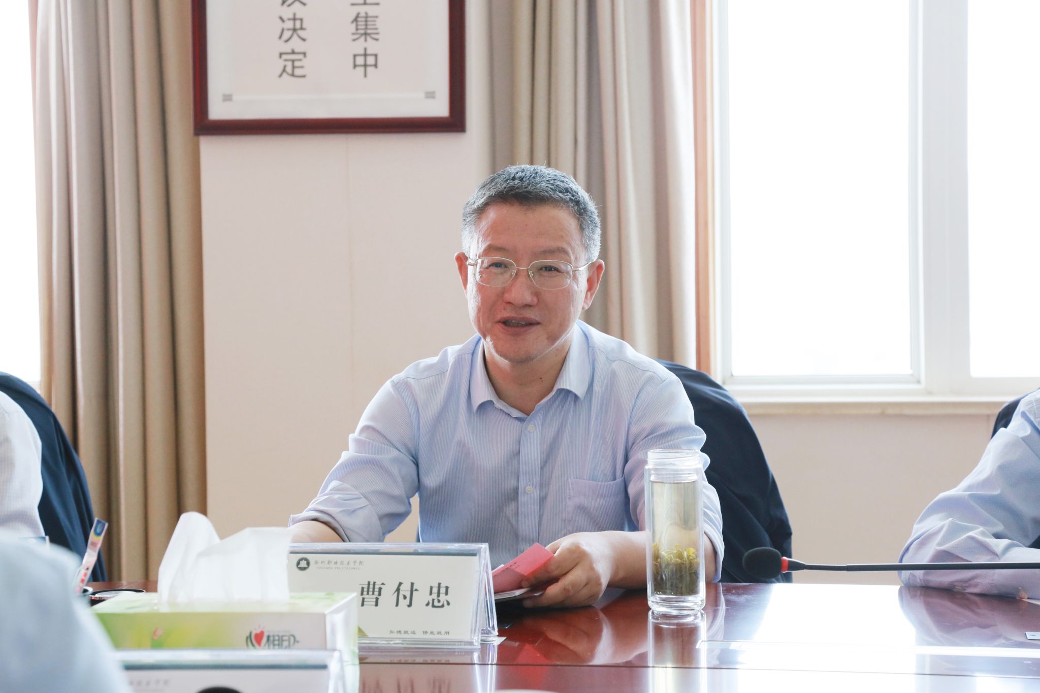 座谈会上,曹付忠对阜阳幼儿师范高等专科学校一行的到来表示热烈欢迎。他指出,“三全育人”项目从理论到落地是长期过程,未来也将越抓越实;“第二课堂”有效衔接了课内外育人环节,提高了学生综合素质;“一站式”学生社区要做到党建引领、力量下沉、诉求响应,真正做好服务工作。曹付忠表示,高校要跟上城市发展的步伐,与时俱进,希望今后双方进一步加强交流沟通,互相学习、互相借鉴、互相提高,共同谱写安徽高等职业教育新篇章。