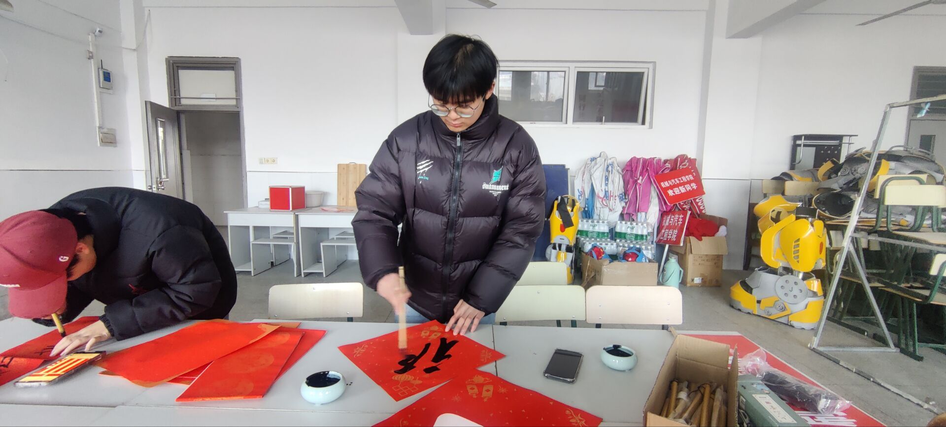 1月4日下午,在机汽学院学生会办公室,学生党员们热情洋溢,他们挥毫泼墨,书写着饱含祝福的春联。每一笔、每一划都流露出对美好生活的期许和对传统文化的热爱。学生会干部把春联送进宿舍,这些春联不仅是对传统文化的传承,更是对同学们深深的关怀与祝福。