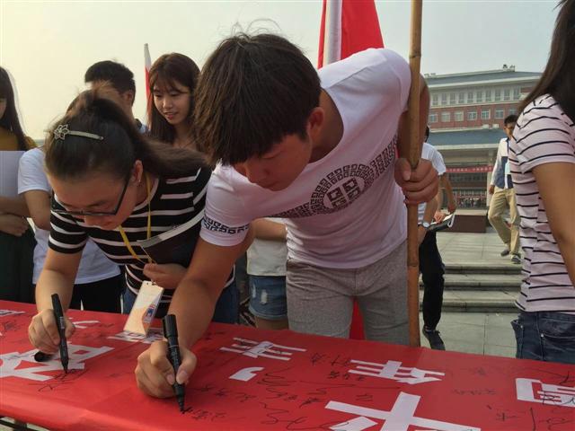 仪式之后,同学们纷纷在“铭记历史、缅怀先烈、珍爱和平、开创未来”横幅上签名留念。