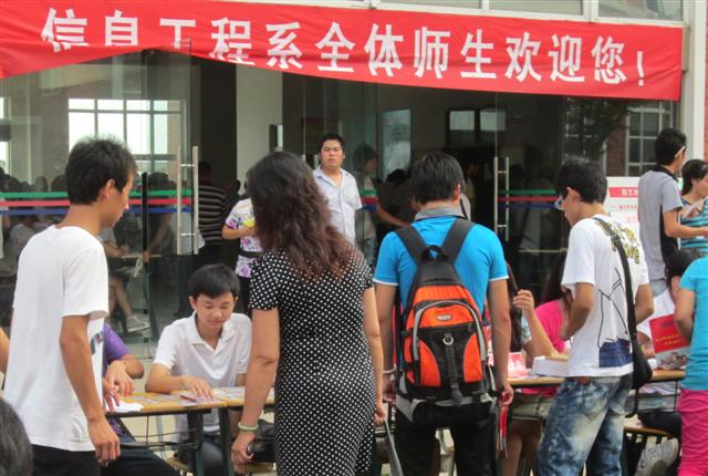 2011年9月13日,amjs澳金沙门线路首页校园内彩旗飘飘喜气洋洋,信息工程系也迎来2011级莘莘学子入学报到。我系工作人员在卜锡滨主任和程洪斌书记的安排下,以热情的态度、周到的安排为11级新生献上了最优质的服务。