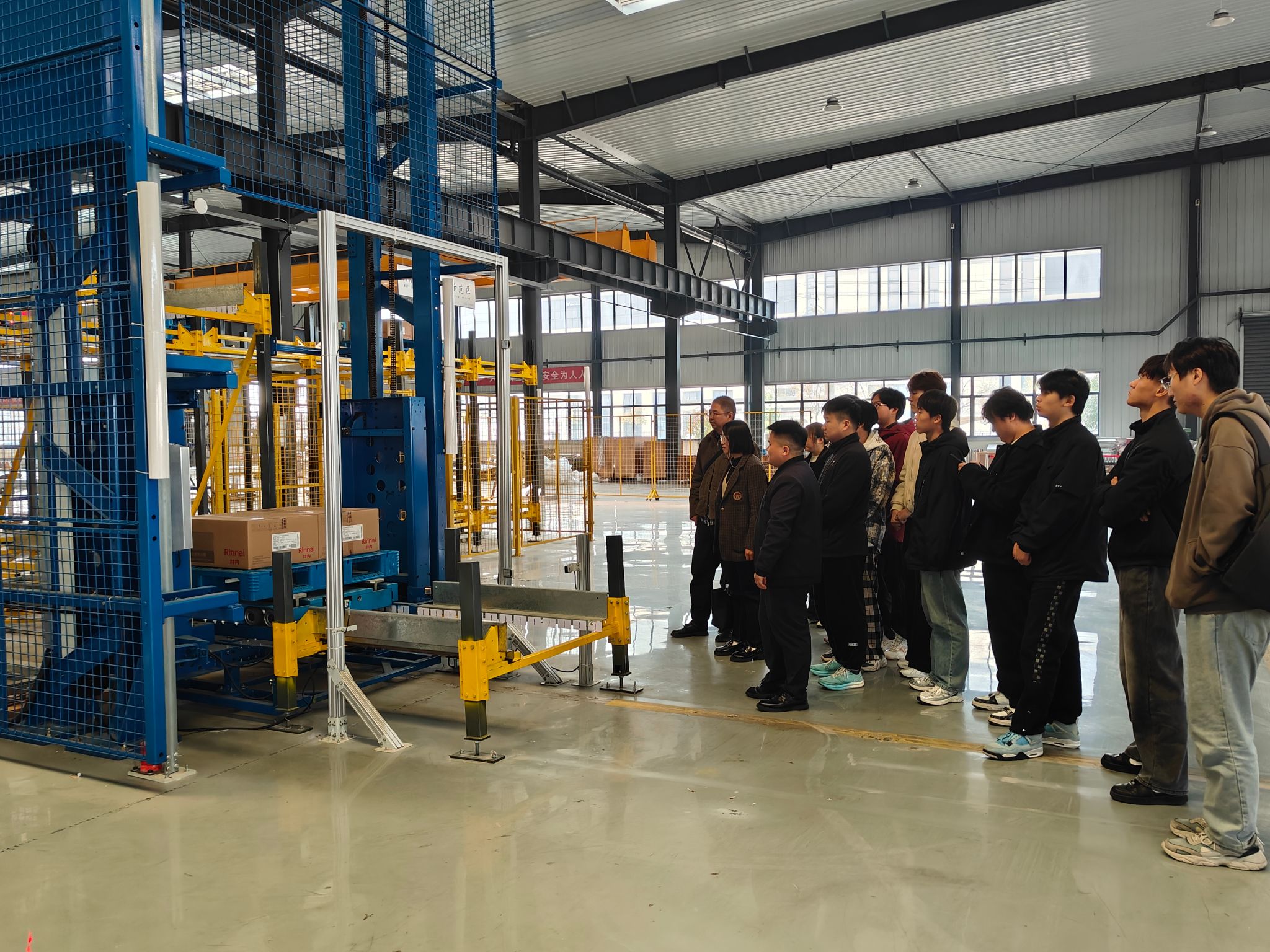 最后,电子信息系学生在俞教授的带领下进入公司车间进行参观实践,学习了产品产线自动化改造项目的工作流程,体验了公司研发的AI智能投篮机器人和AGV物料搬运的工作过程。