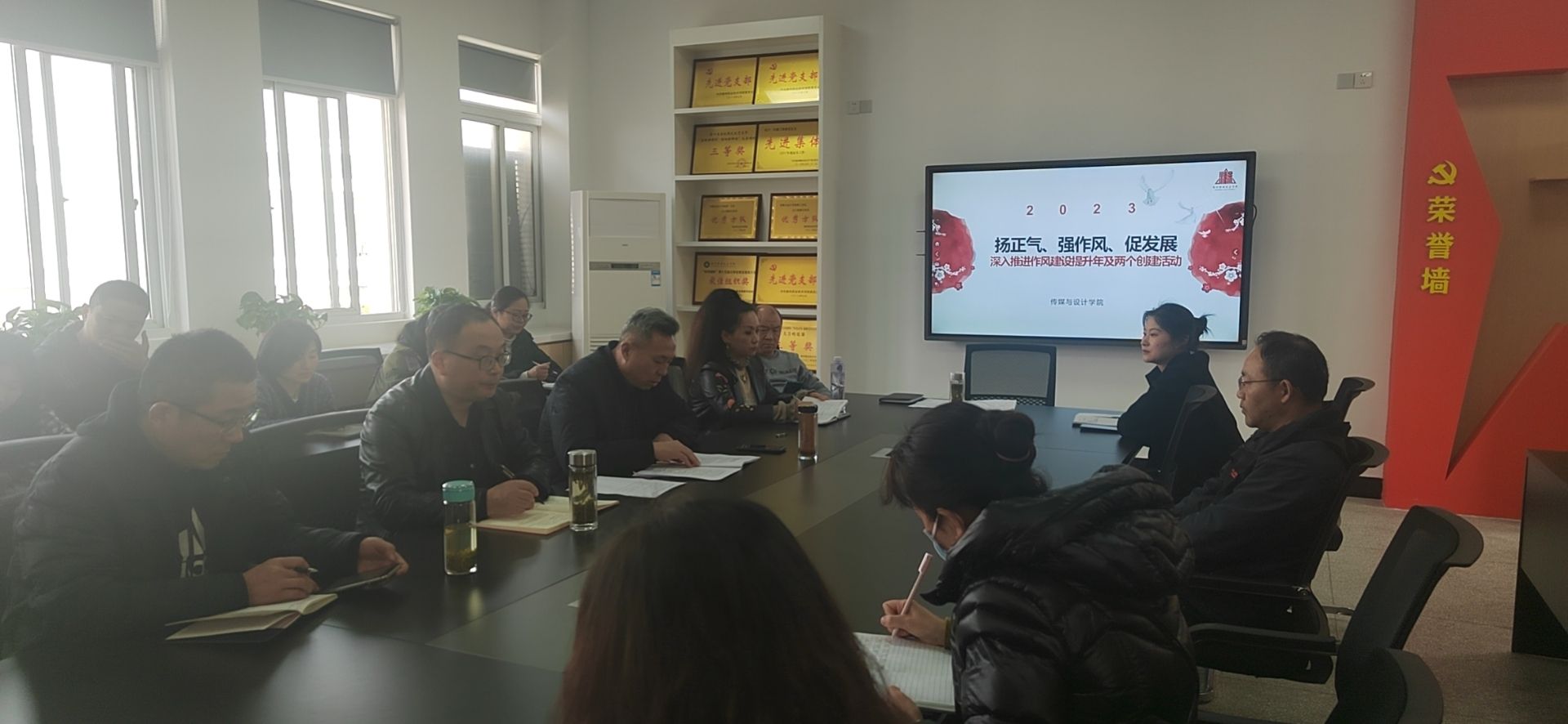为全面贯彻党的二十大精神,进一步落实中央、省、市关于作风建设的部署要求,传媒与设计学院党总支于3月27日下午召开“‘扬正气、强作风、促发展’深入推进作风建设提升年及两个创建活动”会议,学习《amjs澳金沙门线路首页深入推进作风建设提升年行动方案》有关内容。会议由学院党总支书记王广保主持,全体教职工参会。