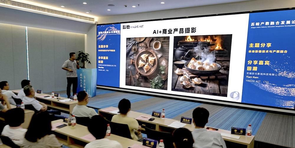 安徽影也的CTO田瀚老师则从技术革新的角度重点分享了与我校及苏研院合作的“暑期工作坊”项目,目标通过校企合作在融合AI、三维扫描、虚拟拍摄等新技术的商业影像项目实战中定向培养专业人才。